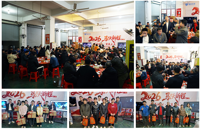 国华科技2025年尾牙答谢晚宴在温馨的食堂热闹开场。平日里大家就餐的食堂,经过精心布置,彩带飘扬、灯光璀璨,瞬间变成了欢乐的海洋,全体员工欢聚一堂,共享这一欢乐时刻。